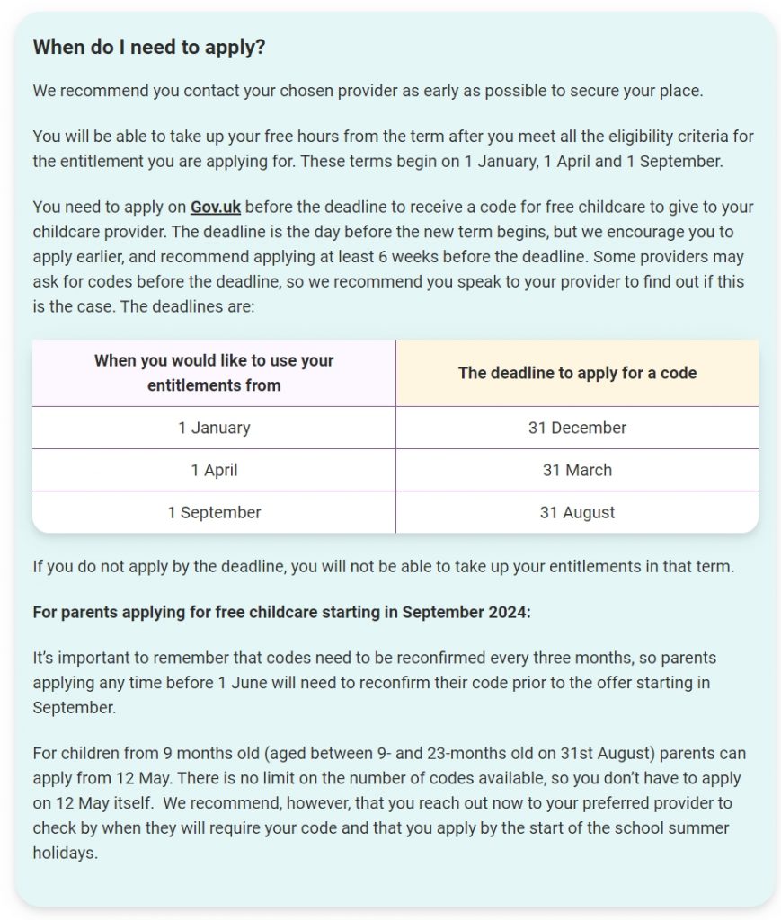 You need to apply on Gov.uk before the deadline to receive a code for free childcare to give to your childcare provider. The deadline is the day before the new term begins, but we encourage you to apply earlier, and recommend applying at least 6 weeks before the deadline. Some providers may ask for codes before the deadline, so we recommend you speak to your provider to find out if this is the case. The deadlines are: