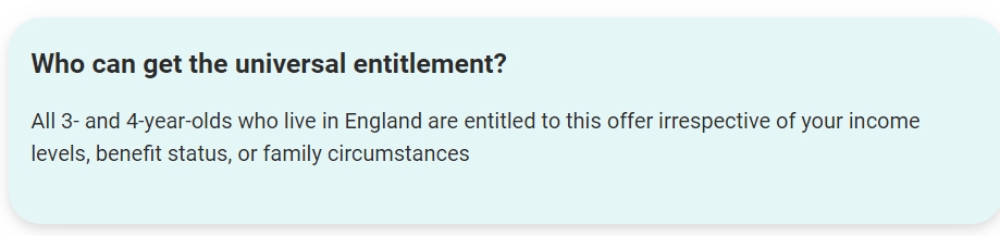 All parents regardless of employment status, family circumstances, or income levels are eligible for the universal 15 hours for 3- and 4-year-olds.