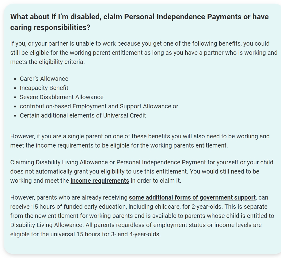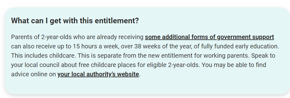 Alternatively, there is a separate entitlement which means that parents of 2 year olds who are already receiving some additional forms of government support, such as Universal Credit or tax credits, can receive 15 hours of early education, including childcare. This is separate from the new entitlement for working parents.