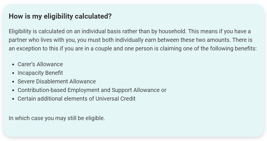 You can earn up to £100,000 adjusted net income per year and be eligible. If you have a partner who lives with you, they must also earn between these two amounts. The £100,000 adjusted net income level was chosen to correspond with income tax thresholds. See our eligibility criteria for more information, including the income requirements for those who are self-employed.