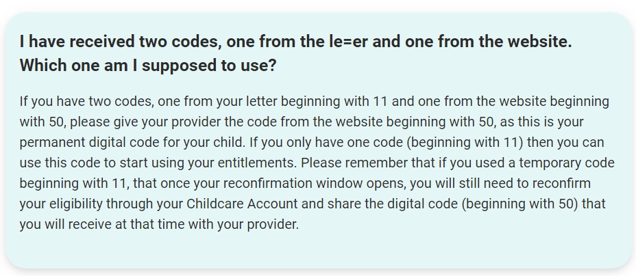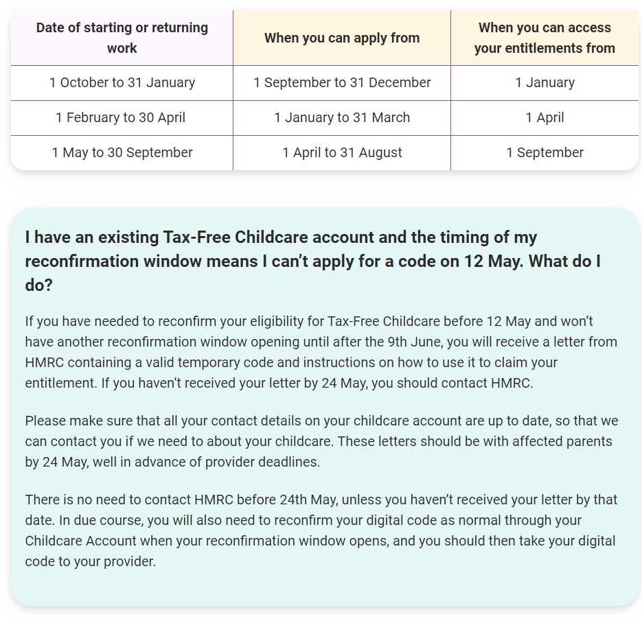 Some parents with existing Tax-Free Childcare accounts may have reconfirmation windows opening before 9th June. If this is you, you will not receive a letter as your reconfirmation window will open in good time for you to register for a code digitally and give it to your provider. We’re confident that all parents will be able to get codes by the time they need them, and there is no limit on the number of codes available.