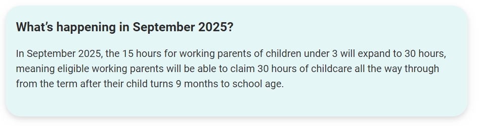 For children from 9 months old (aged between 9- and 23-months old on 31st August) parents can apply from 12 May to receive 15 hours childcare starting from September 2024. We have ensured the HMRC helplines will be open on 12 May if you choose to apply then and experience any difficulties.