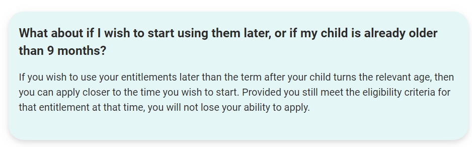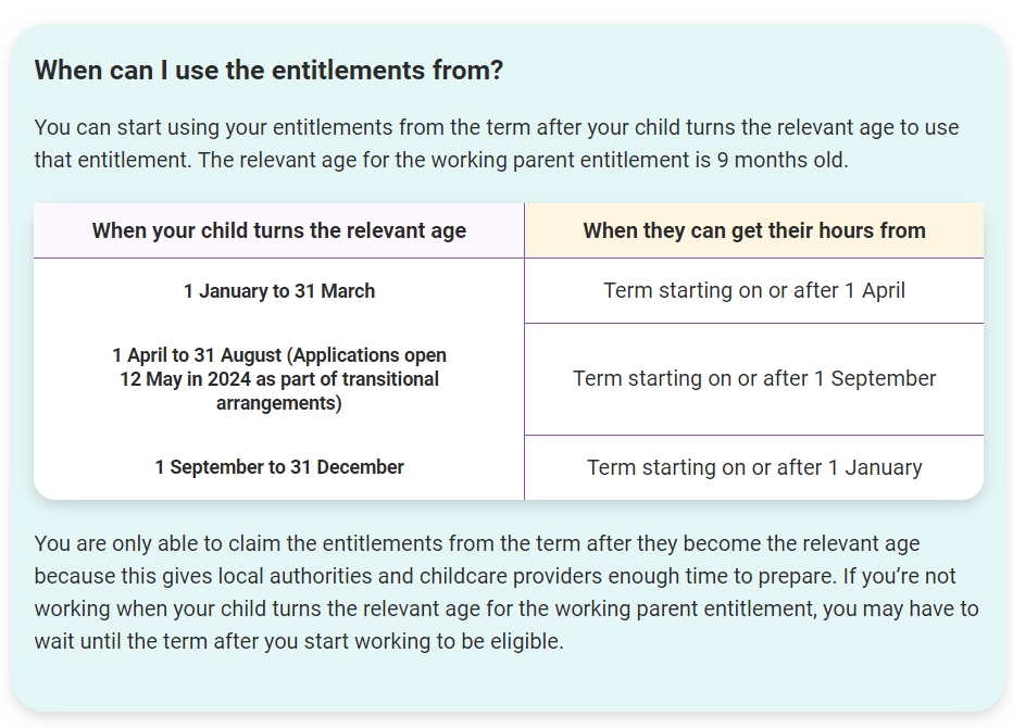 You are only able to claim the entitlements from the term after they become the relevant age because this gives local authorities and childcare providers enough time to prepare. If you’re not working when your child turns the relevant age for the working parent entitlement, you may have to wait until the term after you start working to be eligible.