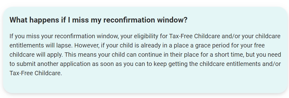You need to log into your childcare account using your Government Gateway ID to reconfirm. The dates between which you should reconfirm will be displayed when you log in.